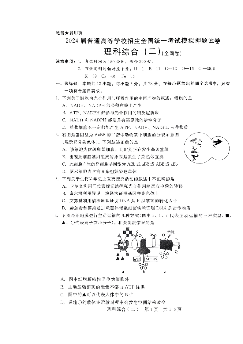 陕西省西安一中2024届普通高等学校招生全国统一考试模拟押题(二)(全国卷)理综