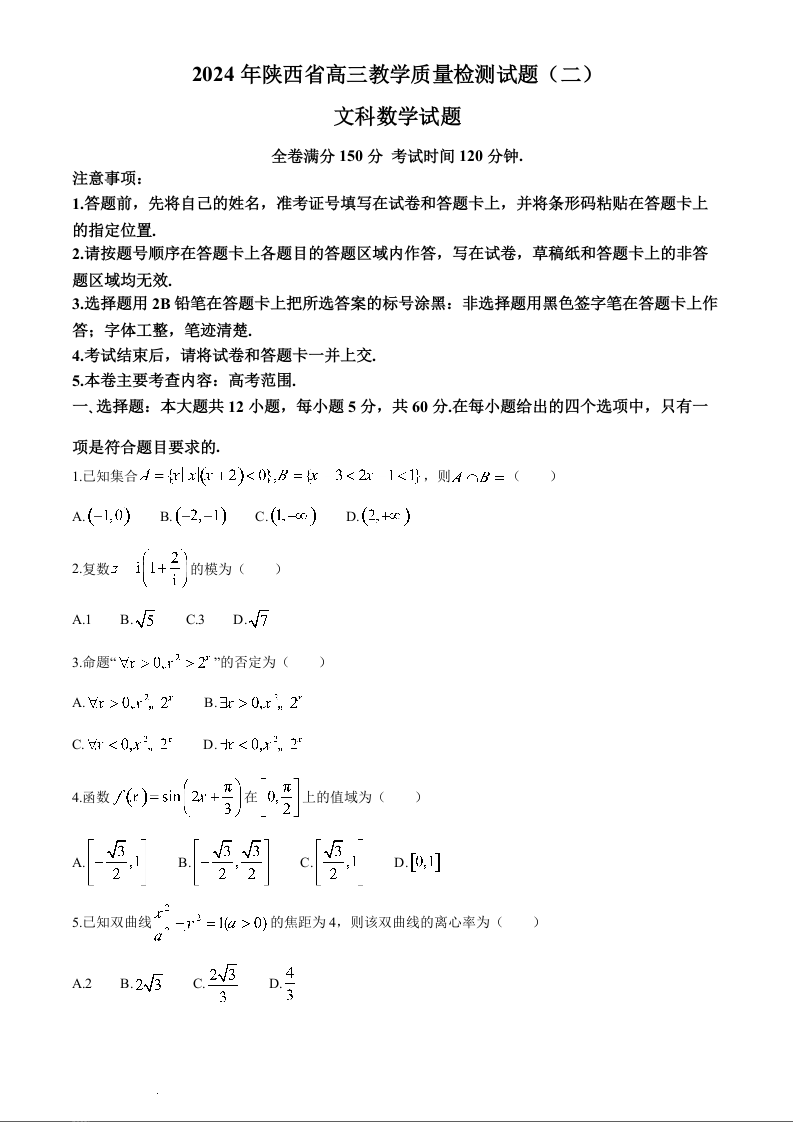 陕西省2024届高三下学期教学质量检测(二)文科数学含答案