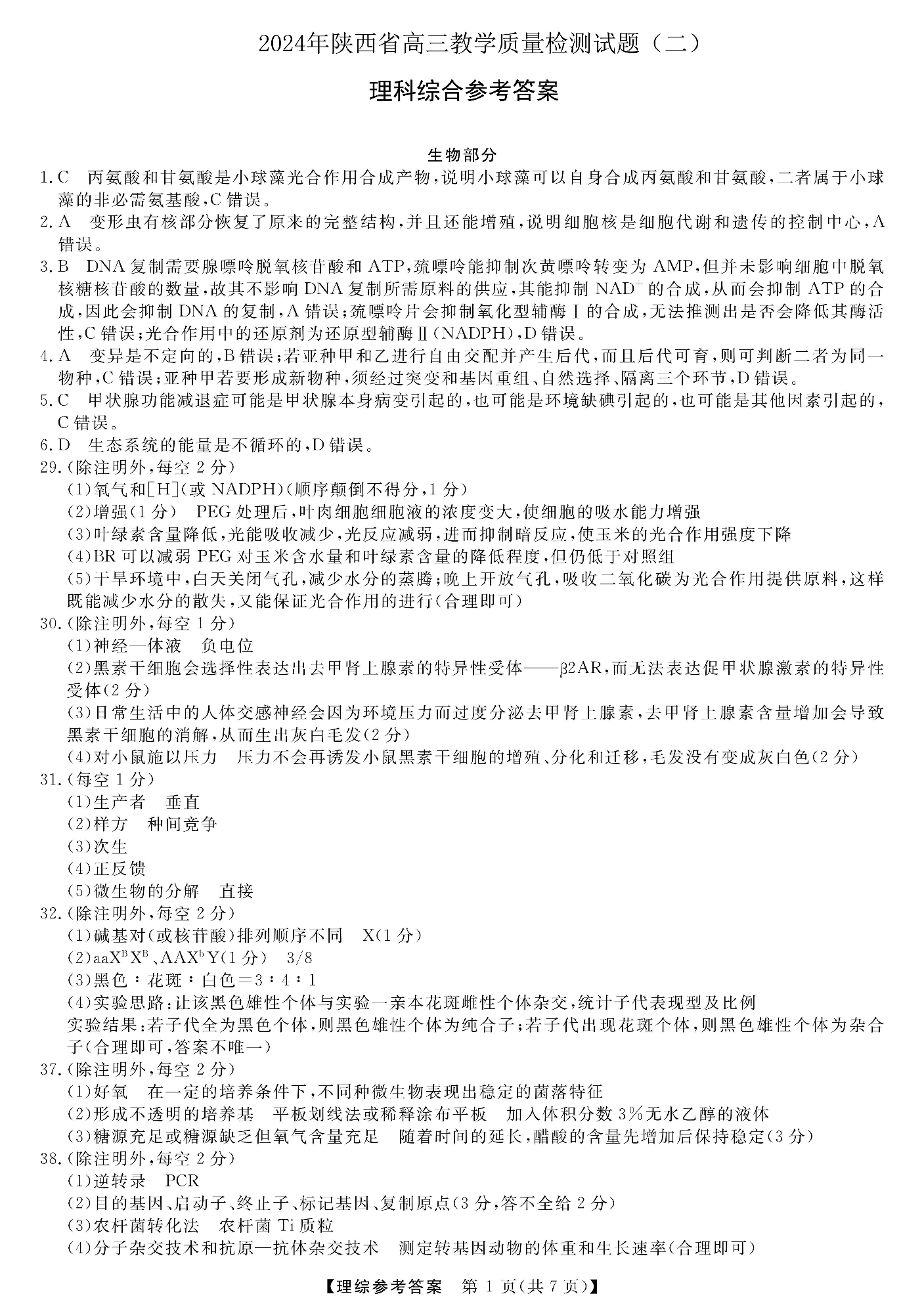 陕西省2024届高三下学期教学质量检测(二)理科综合答案