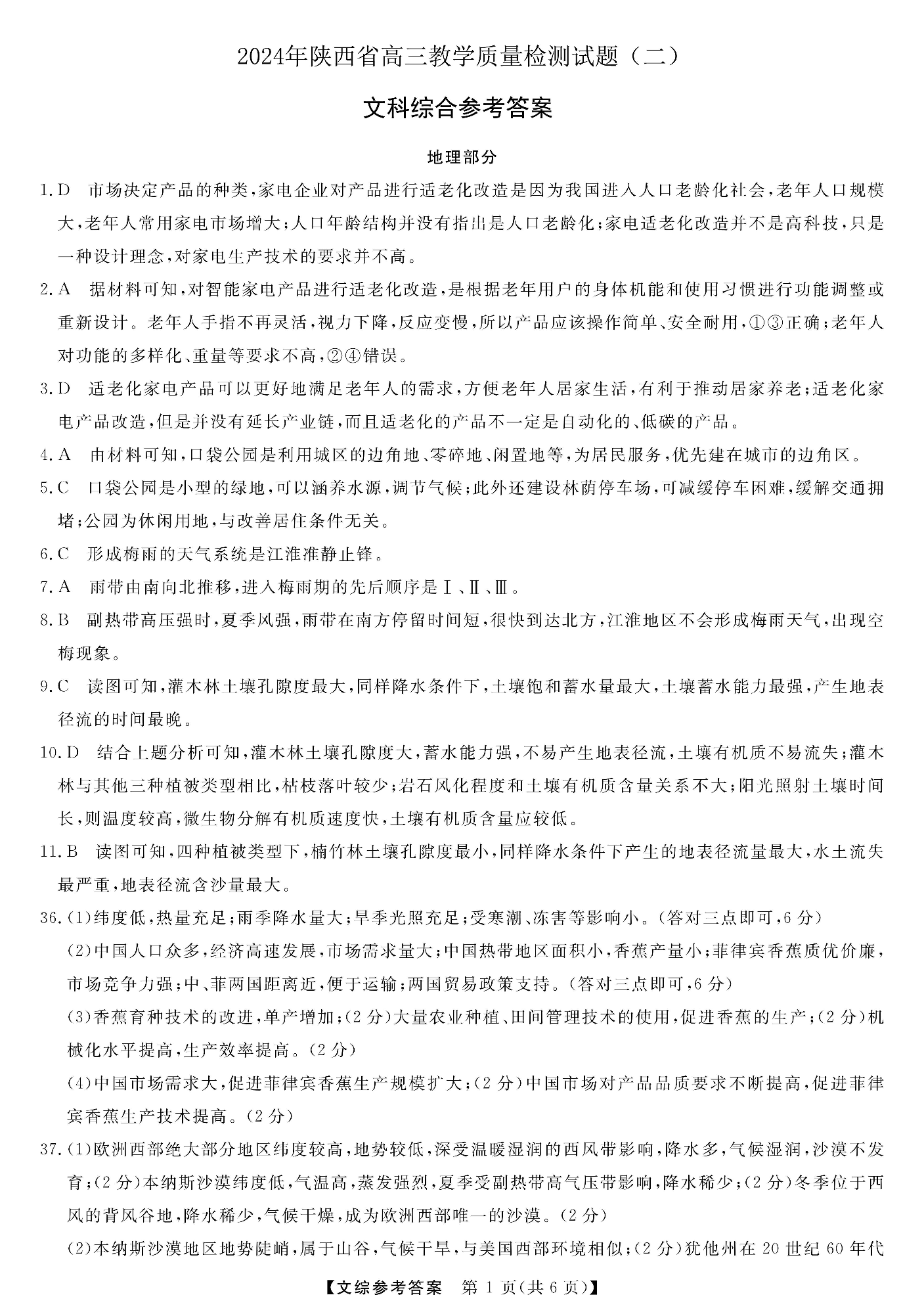 陕西省2024届高三下学期教学质量检测(二)文科综合答案