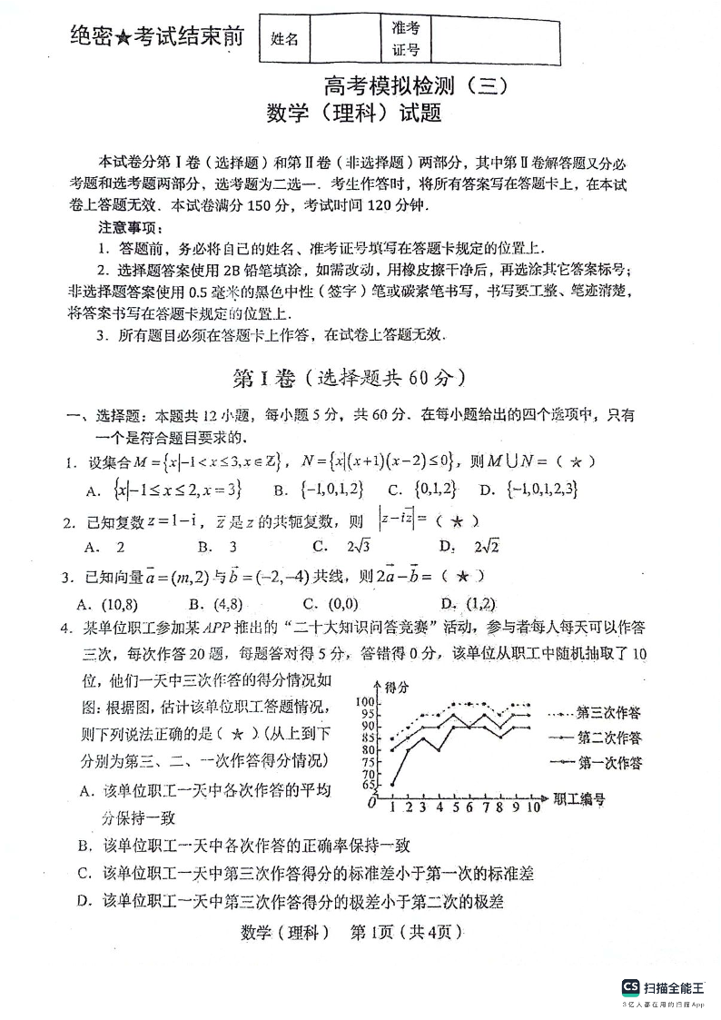 陕西省宝鸡市2024届高三下学期高考模拟检测(三)理科数学