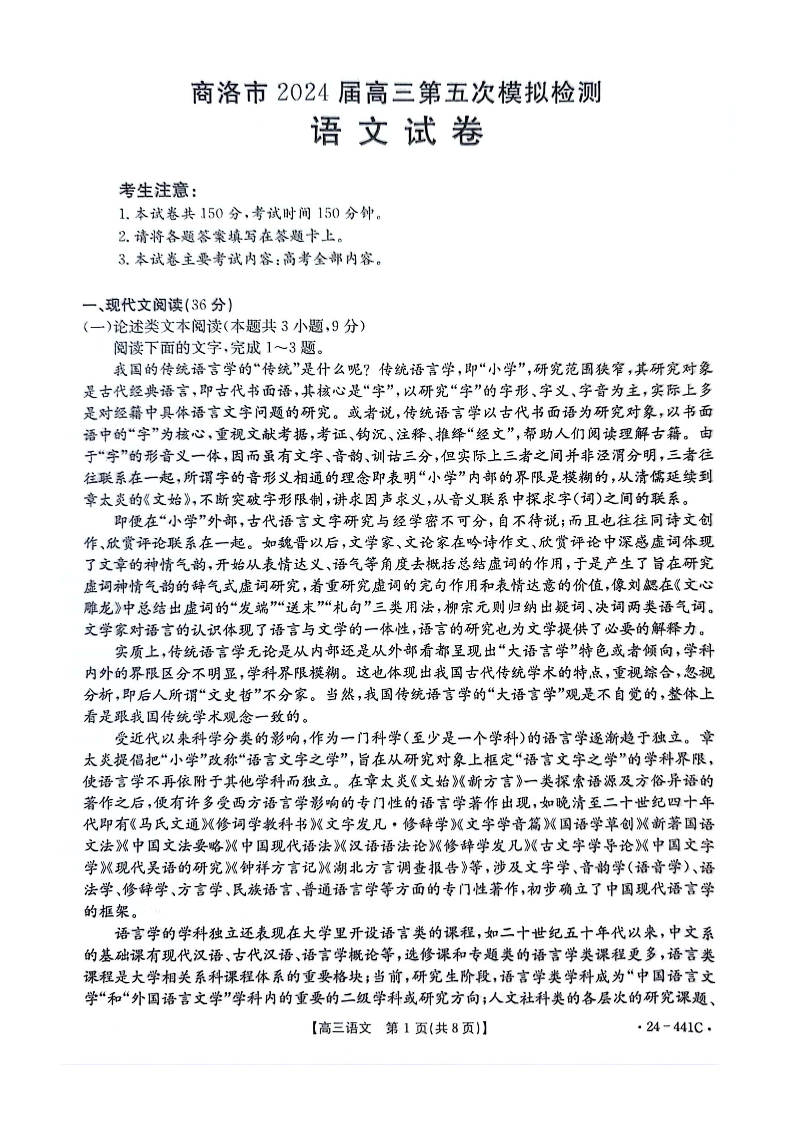陕西省商洛市2024届高三第五次模拟预测语文