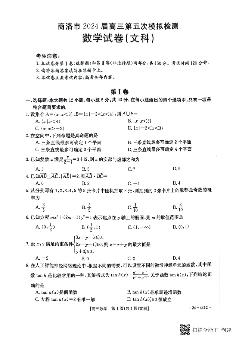 陕西省商洛市2024届高三第五次模拟预测文科数学