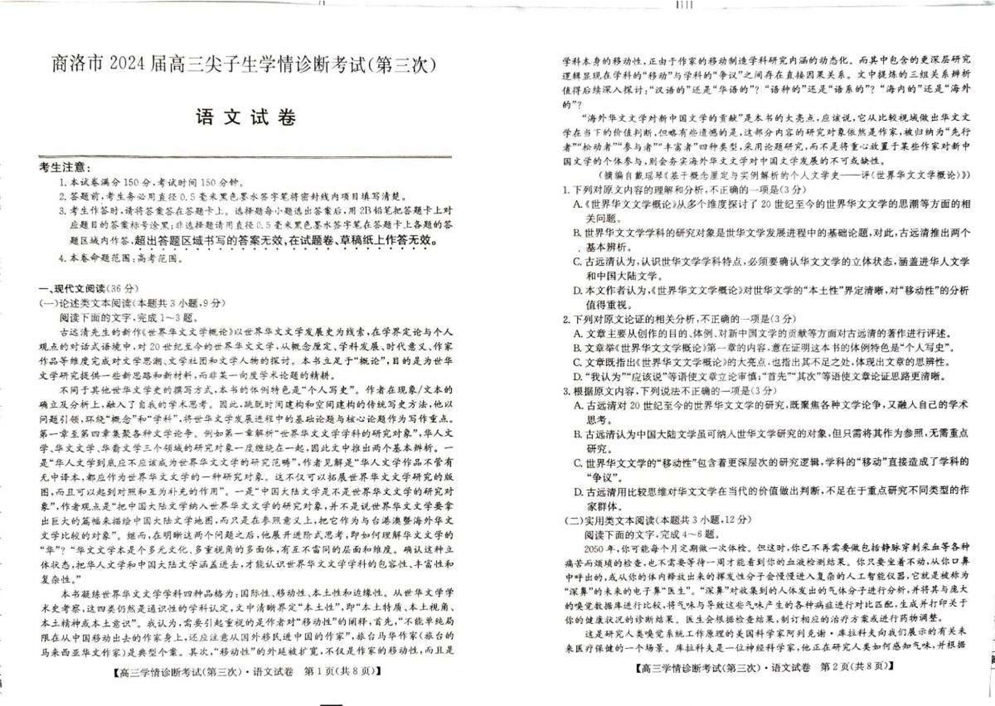 陕西省商洛市2024届高三下学期尖子生学情诊断考试(第三次)语文