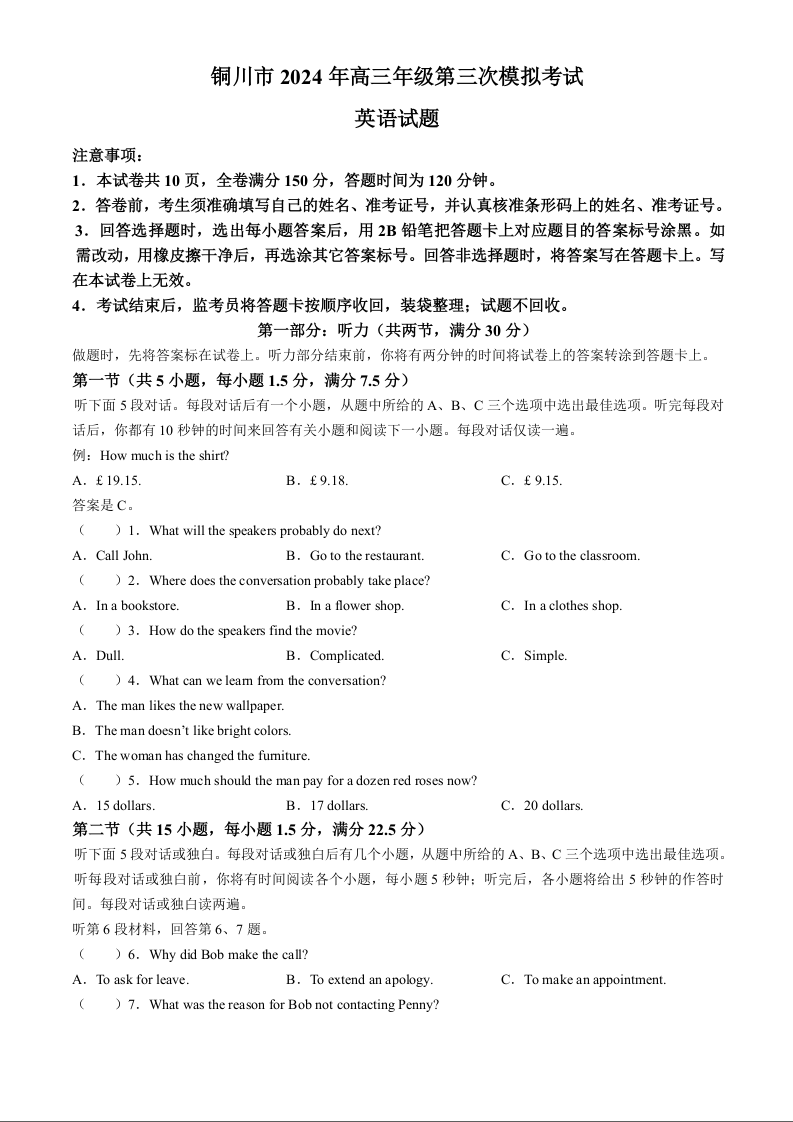 陕西省铜川市2024届高三下学期第三次模拟考试英语含答案