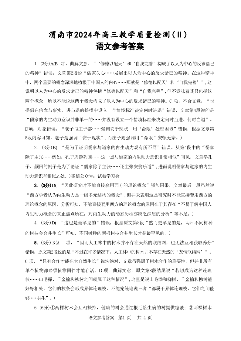 陕西省渭南市2024届高三下学期教学质量检测(二模)语文答案