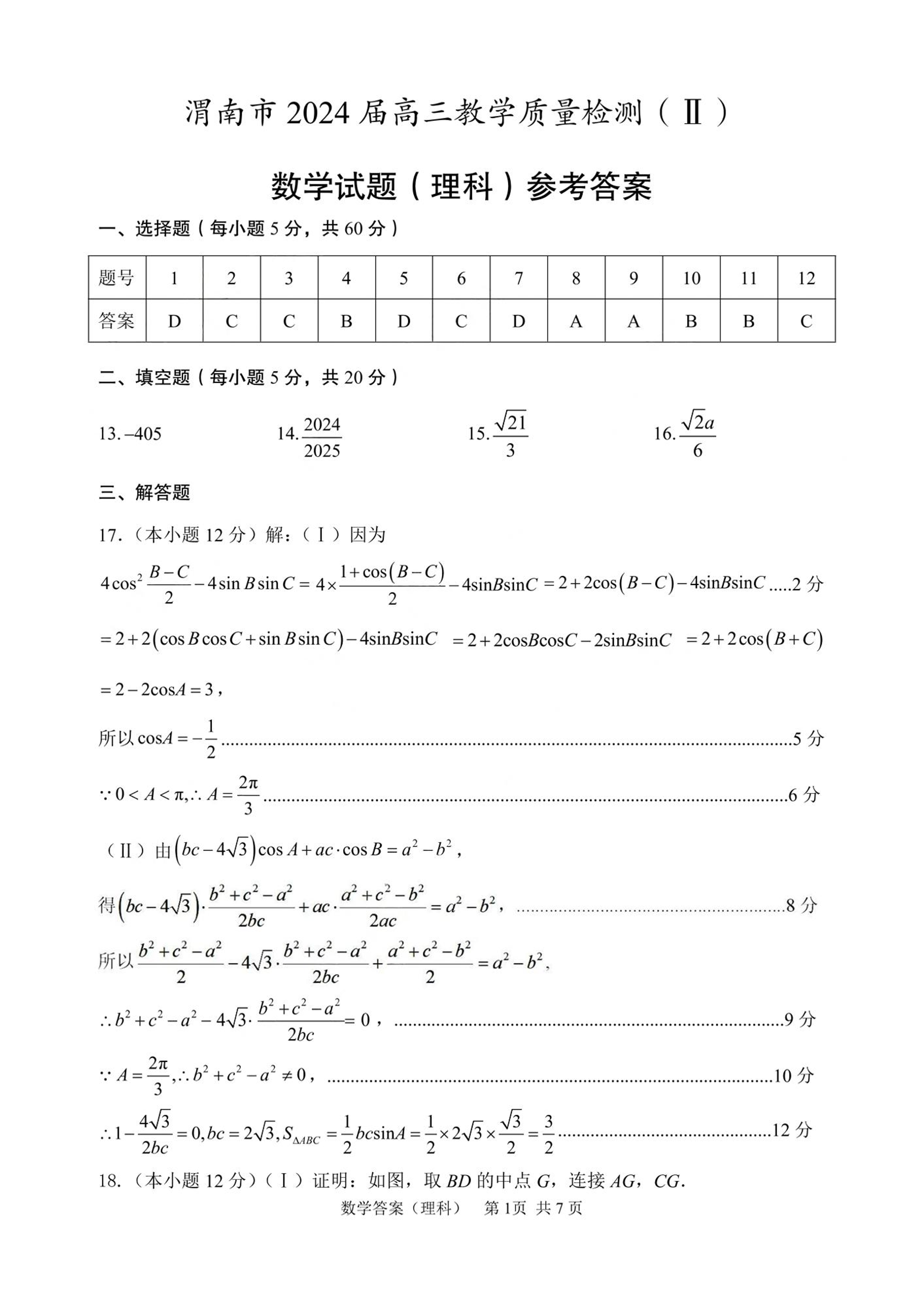 陕西省渭南市2024届高三下学期教学质量检测(二模)理科数学答案