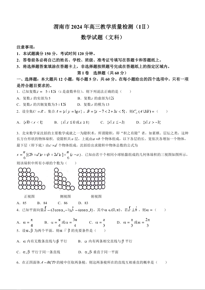 陕西省渭南市2024届高三下学期教学质量检测(二模)文科数学