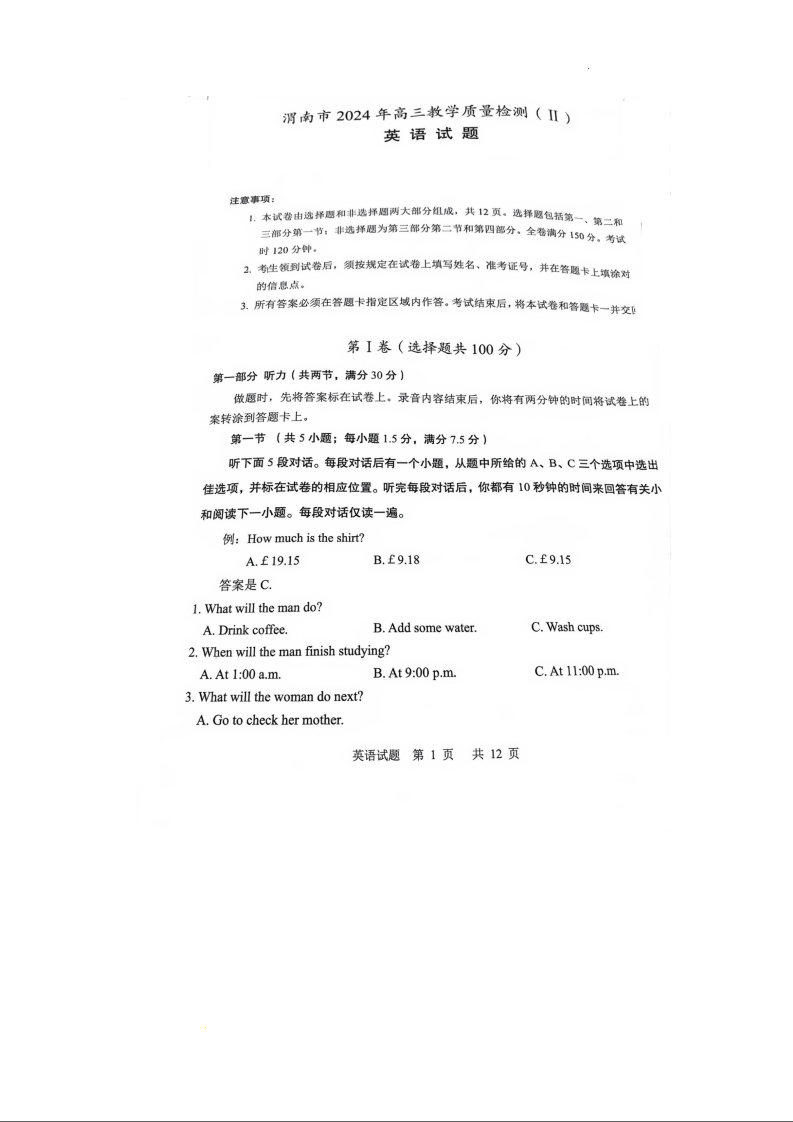 陕西省渭南市2024届高三下学期教学质量检测(二模)英语