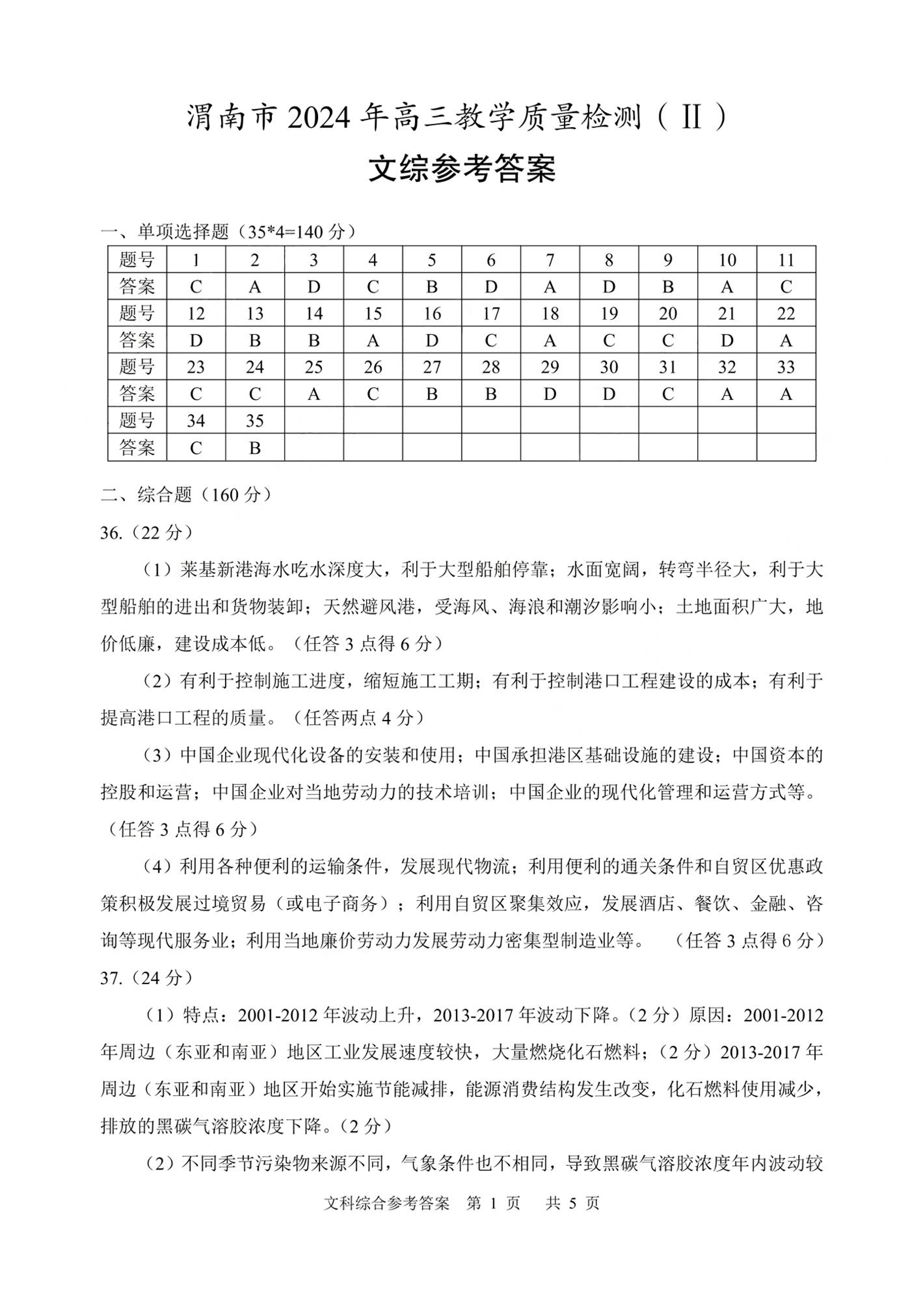 陕西省渭南市2024届高三下学期教学质量检测(二模)理科文科综合答案