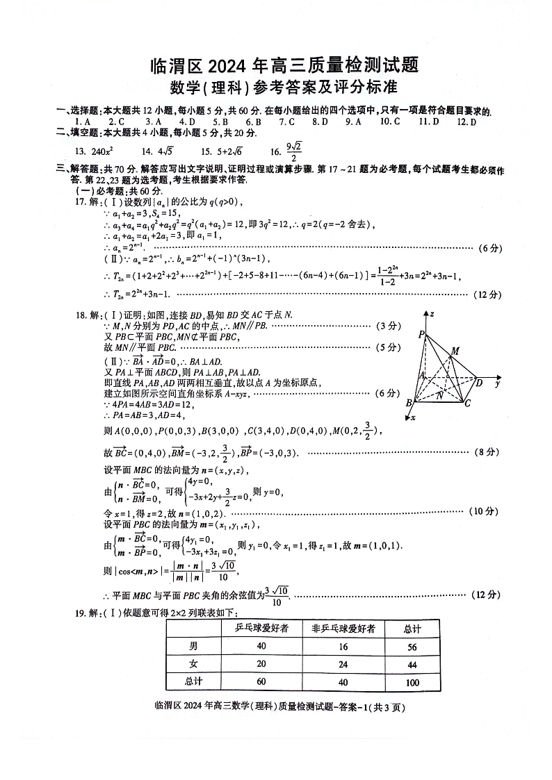 陕西省渭南市临渭区2024届高三下学期三模理科数学答案