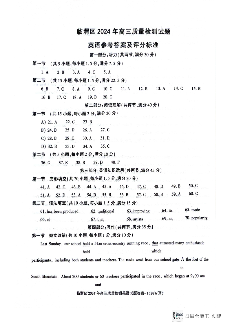 陕西省渭南市临渭区2024届高三下学期三模英语答案