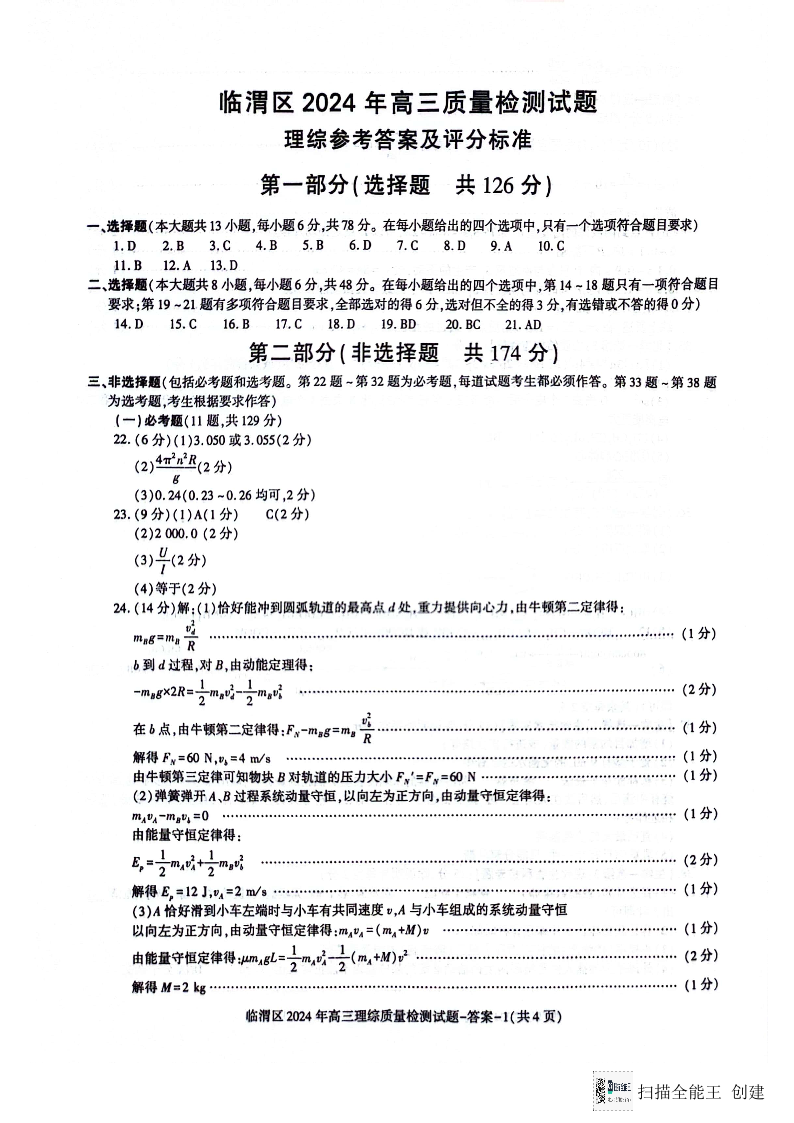 陕西省渭南市临渭区2024届高三下学期三模理科综合答案