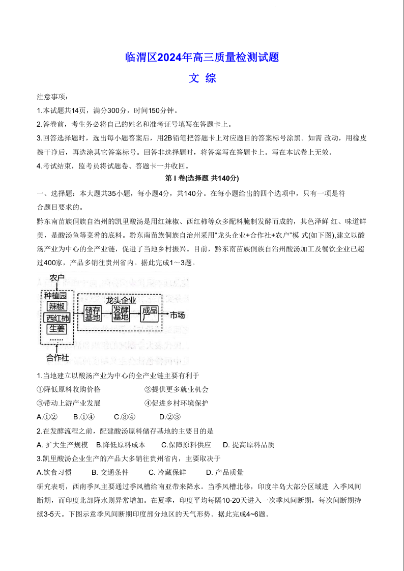 陕西省渭南市临渭区2024届高三下学期三模文科综合含答案