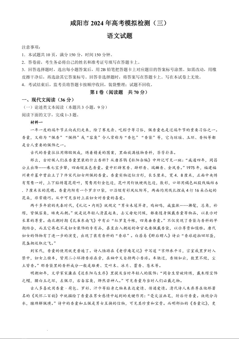 陕西省咸阳市2024届高三高考模拟检测(三)语文