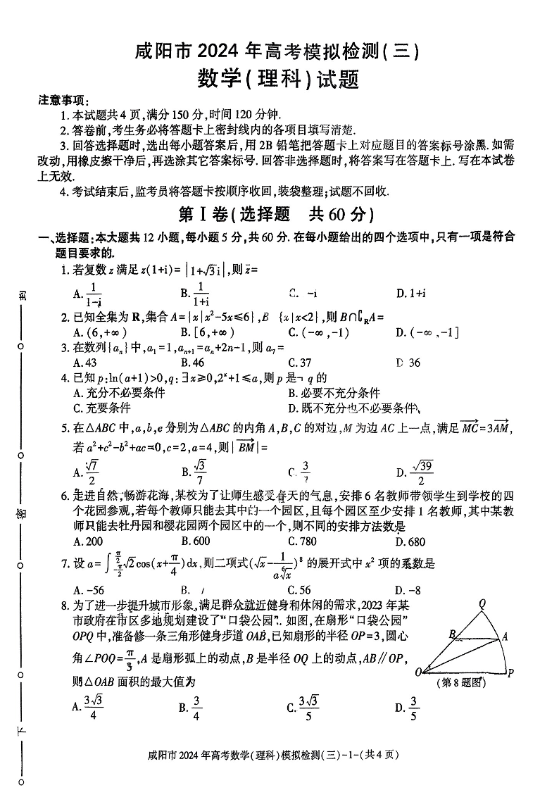 陕西省咸阳市2024届高三高考模拟检测(三)理科数学