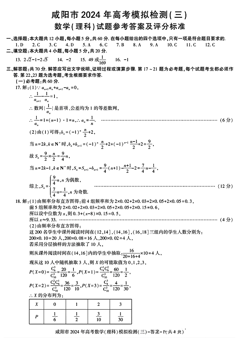 陕西省咸阳市2024届高三高考模拟检测(三)理科数学答案