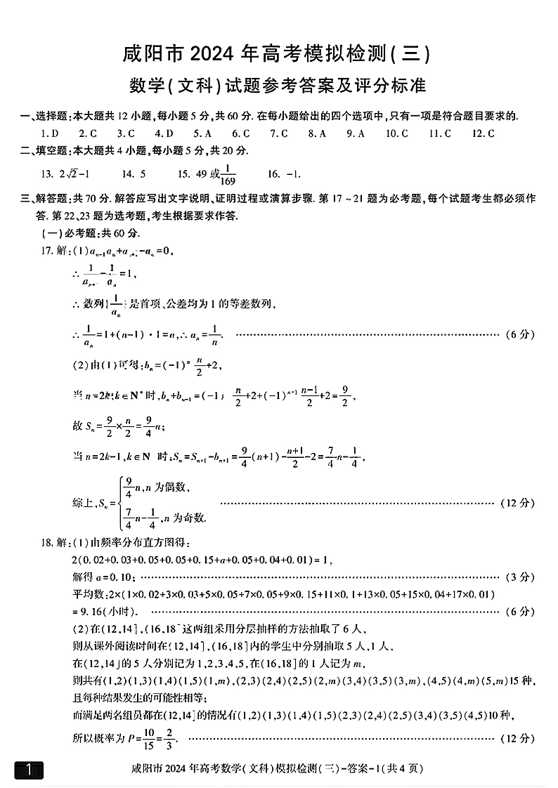 陕西省咸阳市2024届高三高考模拟检测(三)文科数学答案