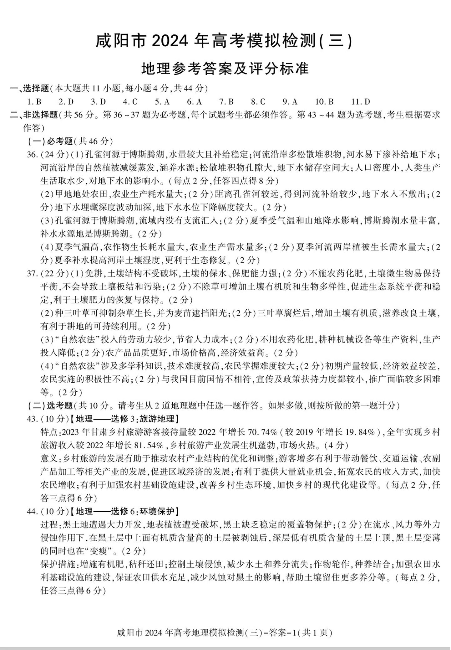 陕西省咸阳市2024届高三高考模拟检测(三)文科综合答案