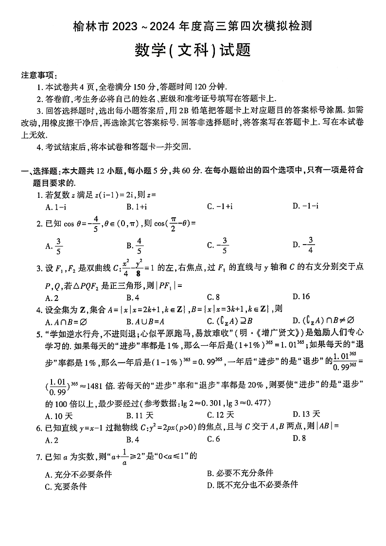 陕西省榆林市2024届高三下学期第四次模拟考试文科数学含答案