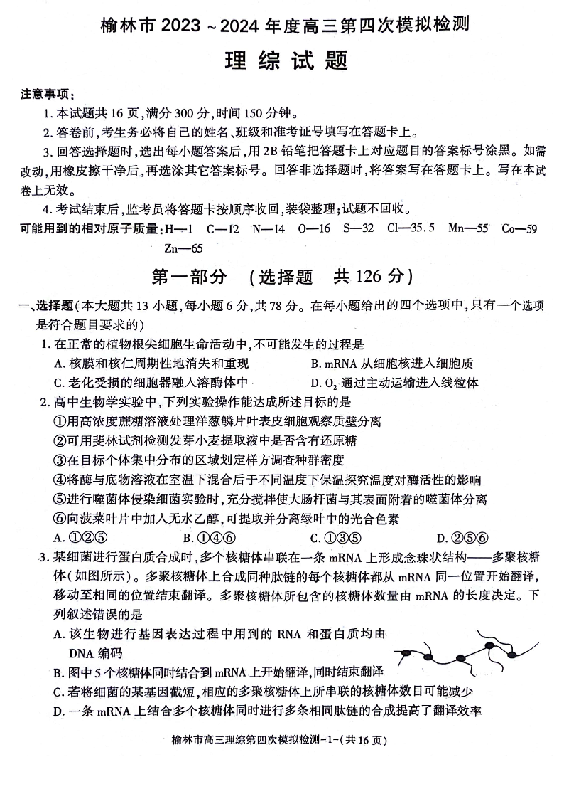 陕西省榆林市2024届高三下学期第四次模拟考试理科综合含答案