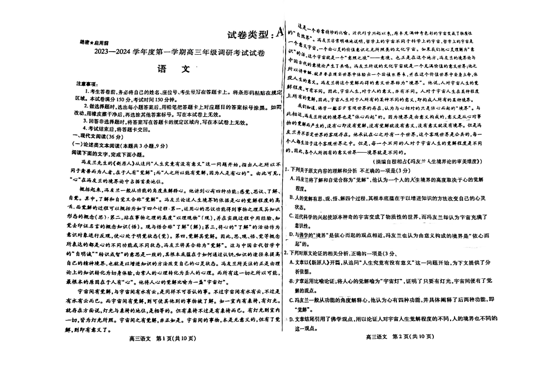 内蒙古包头市2023-2024学年高三上学期开学调研考试语文