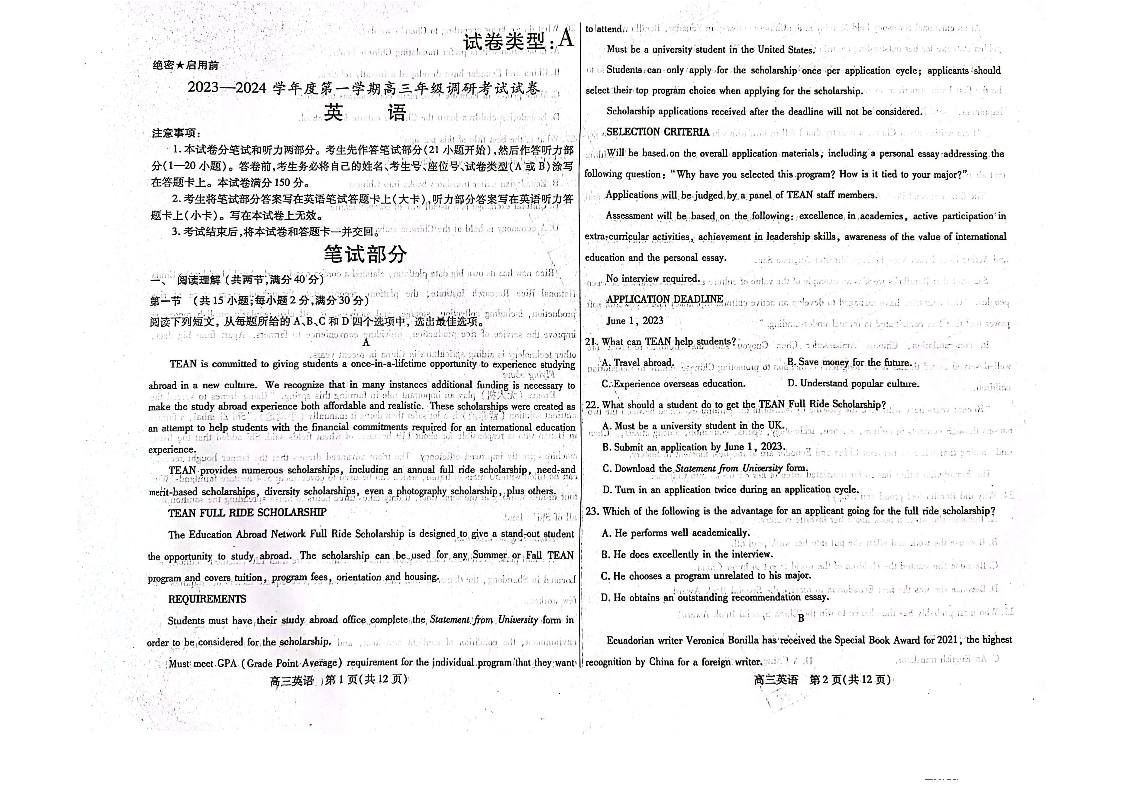 内蒙古包头市2023-2024学年高三上学期开学调研考试英语