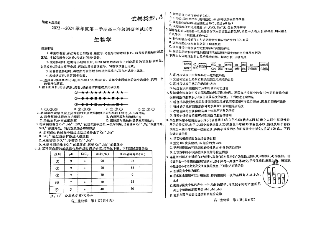 内蒙古包头市2023-2024学年高三上学期开学调研考试生物