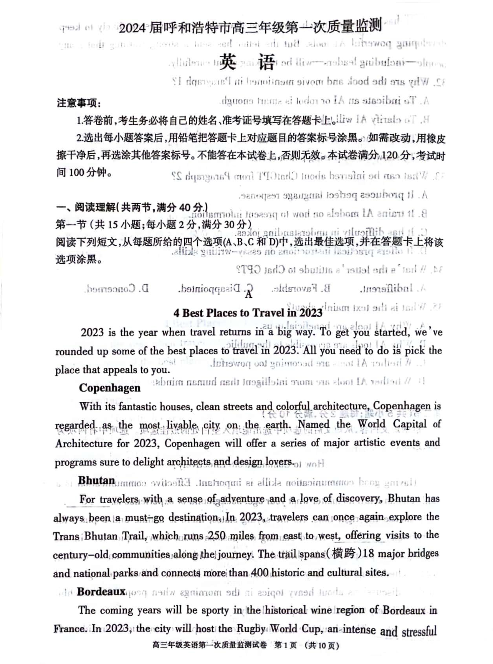 2024届内蒙古呼和浩特市高三年级第一次质量检测英语