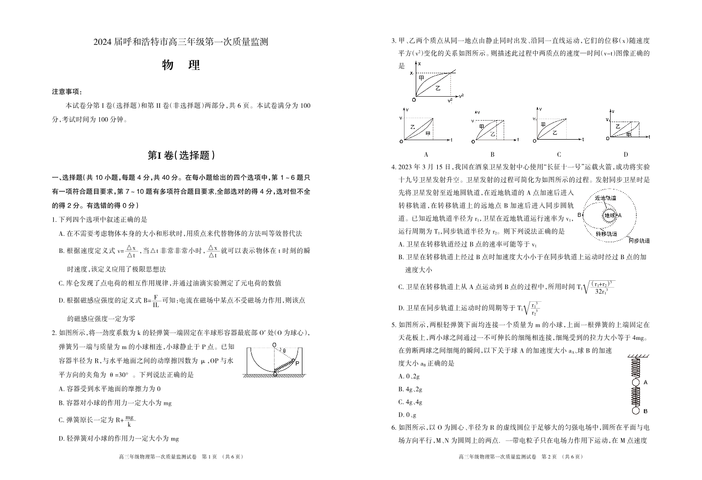 内蒙古呼和浩特市2024届高三第一次质量监测物理