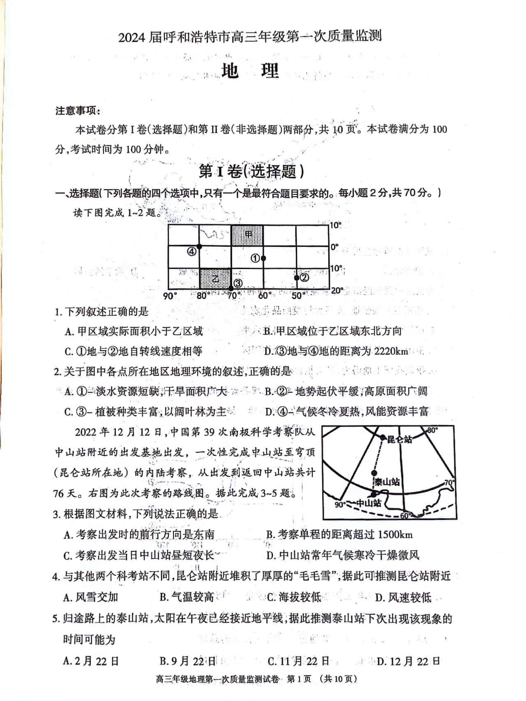 内蒙古呼和浩特市2024届高三第一次质量监测地理