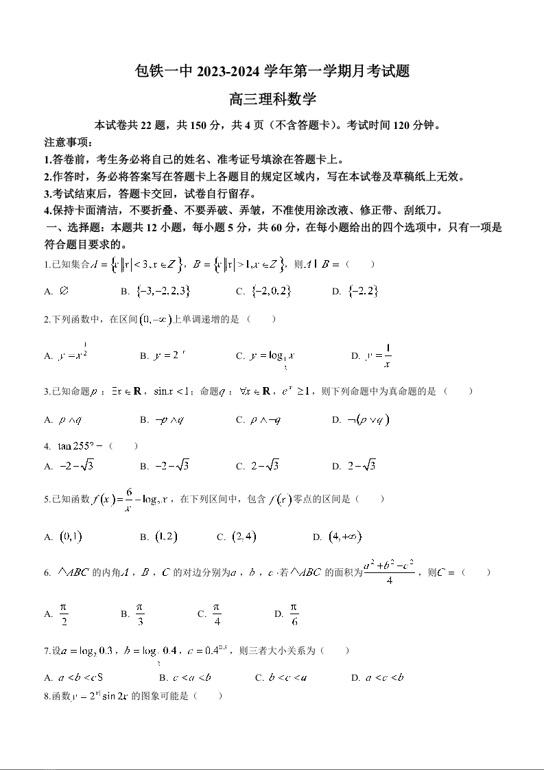 内蒙古包头市包铁一中2024届高三上学期第一次月考数学+答案