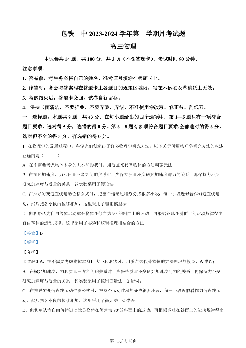 内蒙古包头市包铁一中2024届高三上学期第一次月考物理(精品解析版)