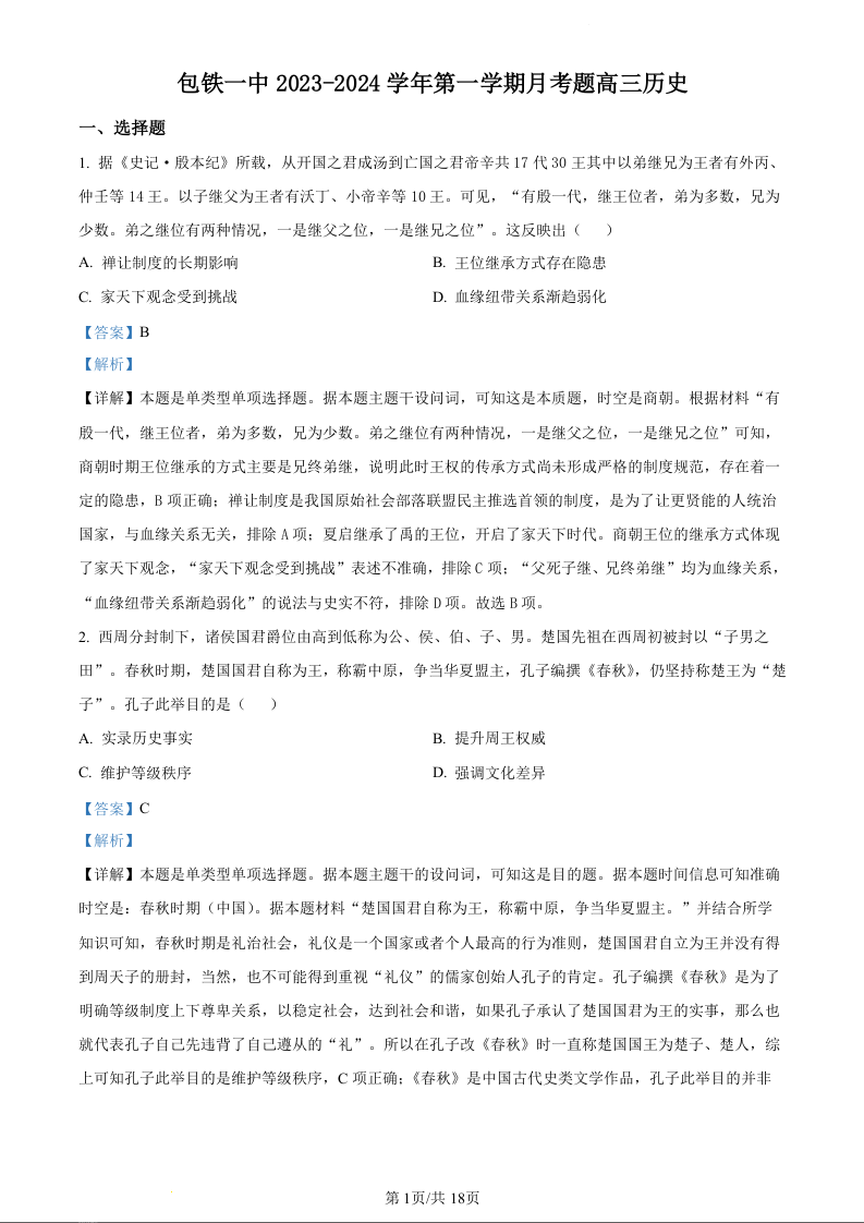内蒙古包头市包铁一中2024届高三上学期第一次月考历史(精品解析版)