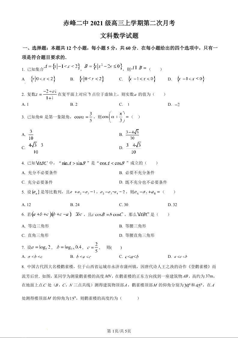 内蒙古赤峰二中2023-2024学年高三上学期10月月考数学(文)试题(原卷版)