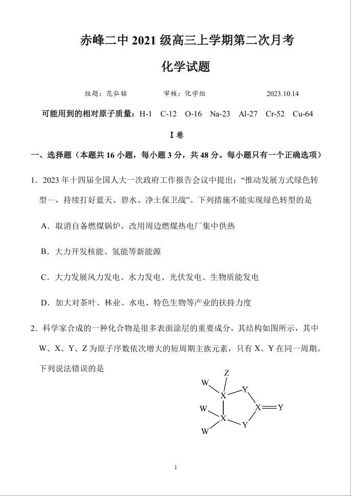 内蒙古赤峰二中2023-2024学年高三上学期10月月考化学