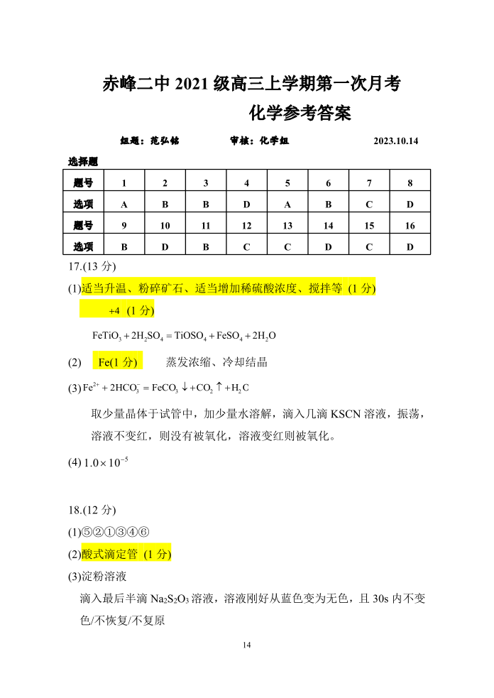 内蒙古赤峰二中2023-2024学年高三上学期10月月考化学答案