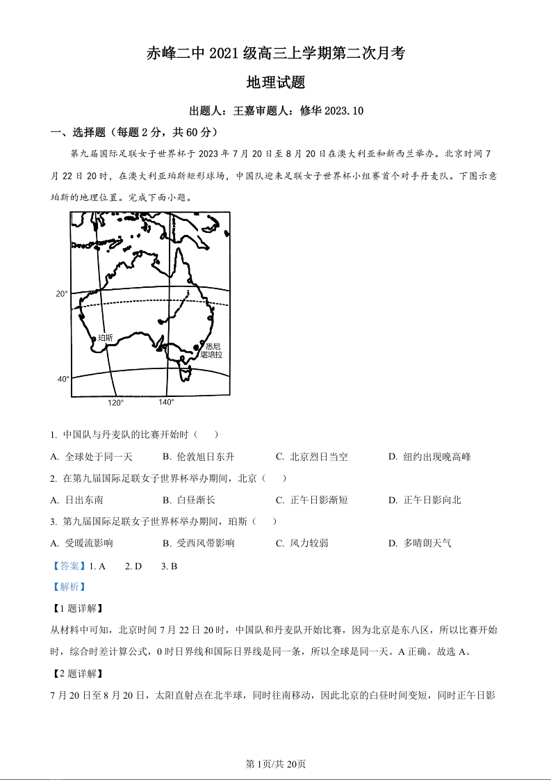 内蒙古赤峰二中2023-2024学年高三上学期10月月考地理试题(精品解析版)