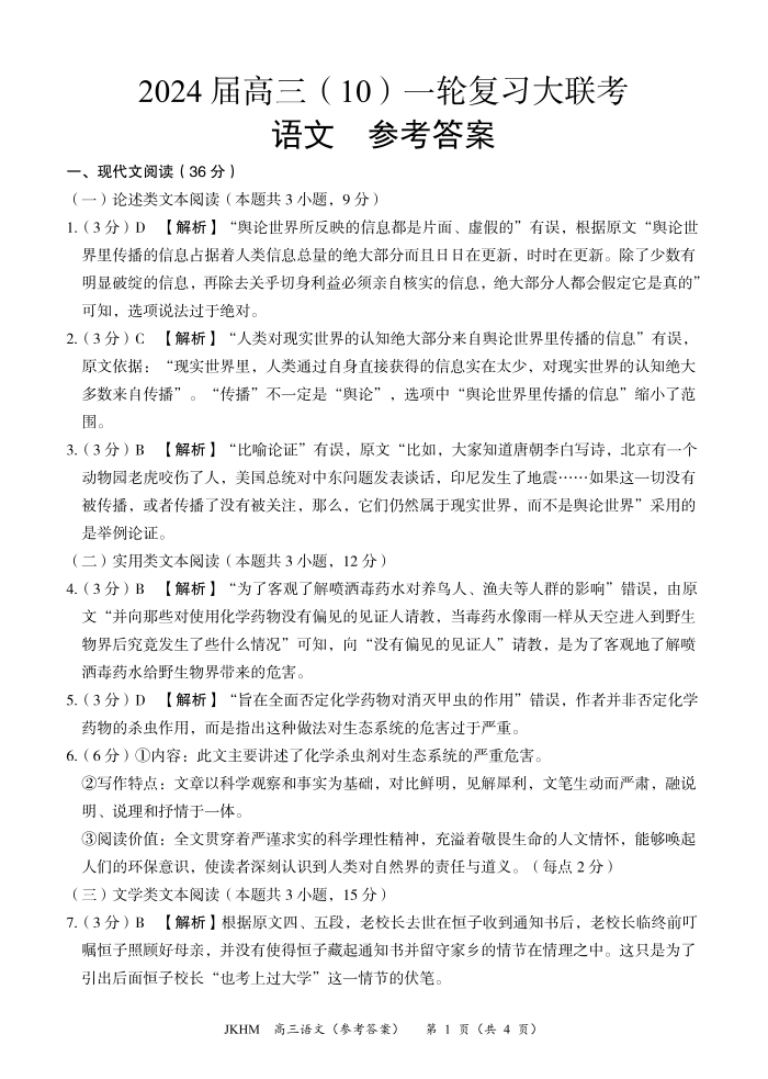 内蒙古赤峰市2023-2024学年高三上学期10月一轮复习联考 语文答案