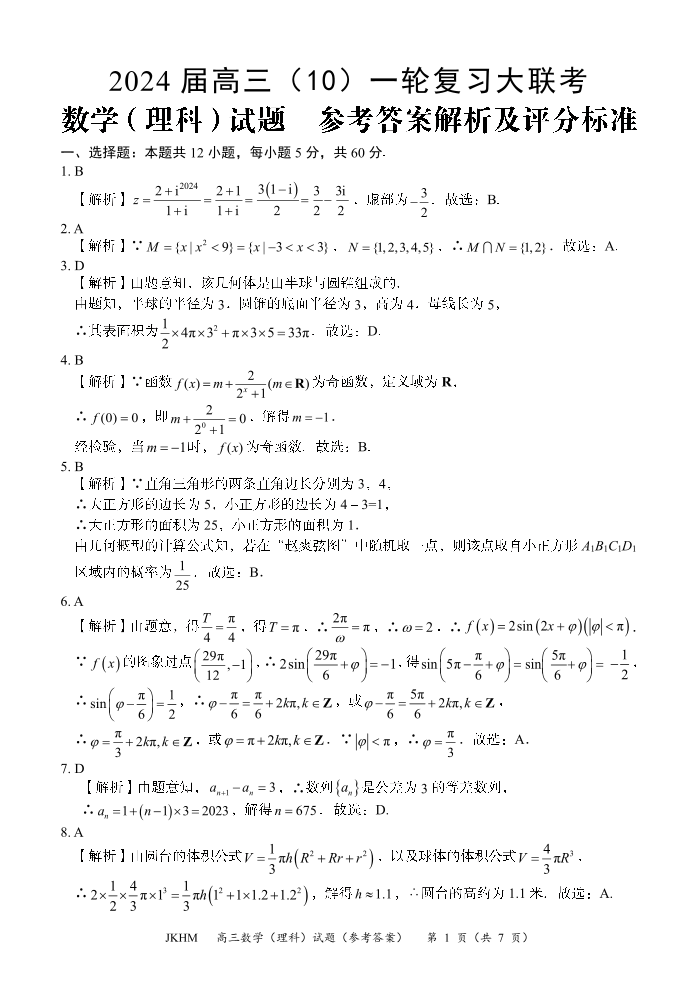 内蒙古赤峰市2023-2024学年高三上学期10月一轮复习联考 理数答案