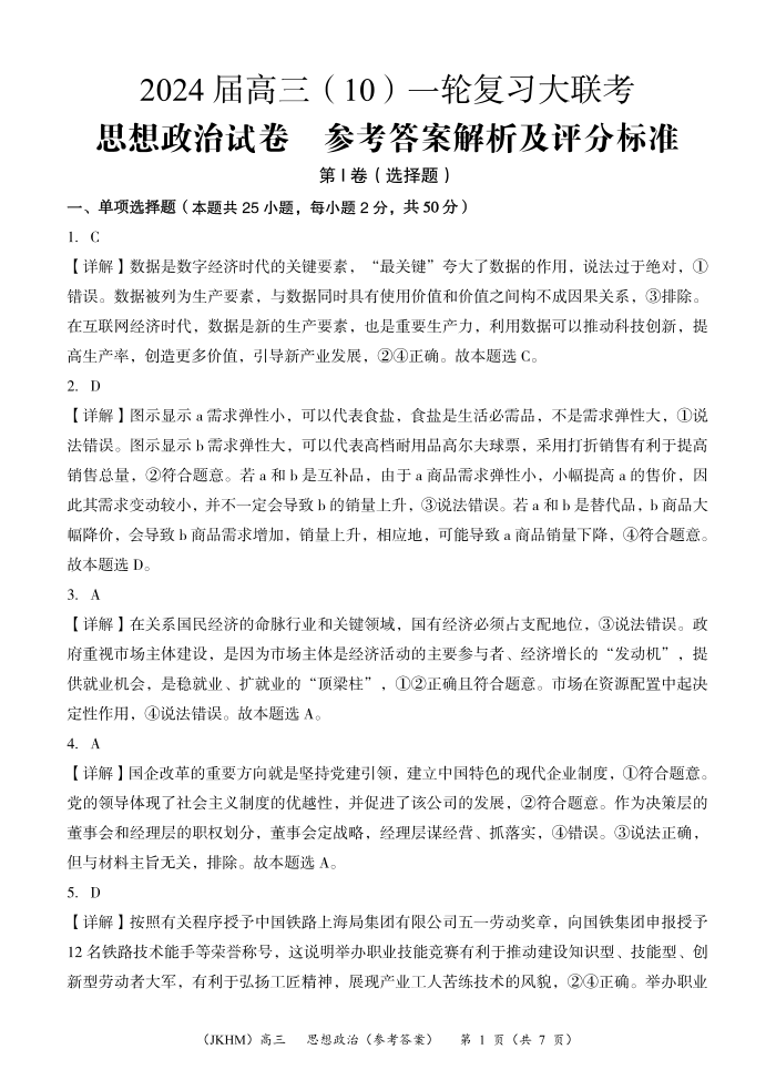 内蒙古赤峰市2023-2024学年高三上学期10月一轮复习联考 政治答案
