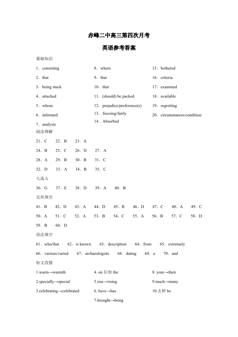 内蒙古赤峰二中2023-2024学年高三上学期第四次月考英语答案