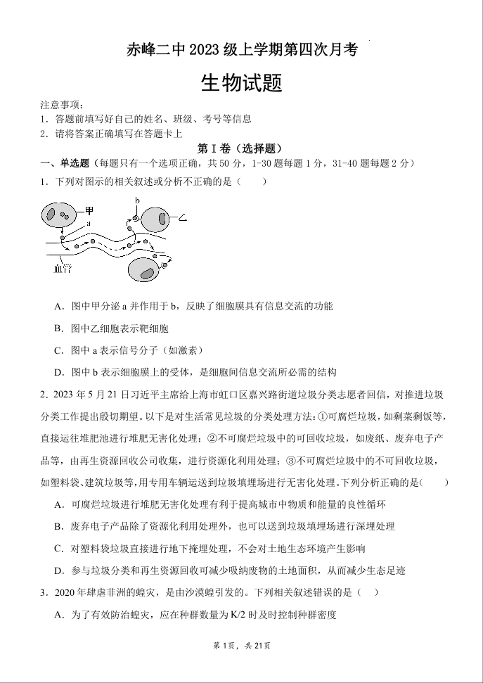 内蒙古赤峰二中2023-2024学年高三上学期第四次月考生物试题