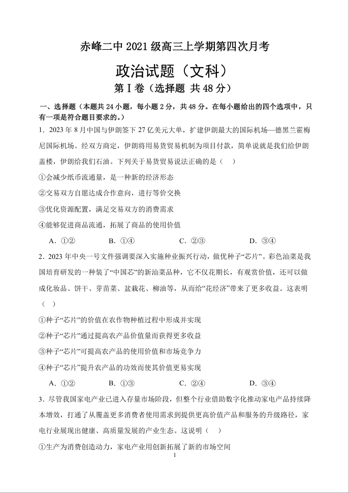内蒙古赤峰二中2023-2024学年高三上学期第四次月考政治试题