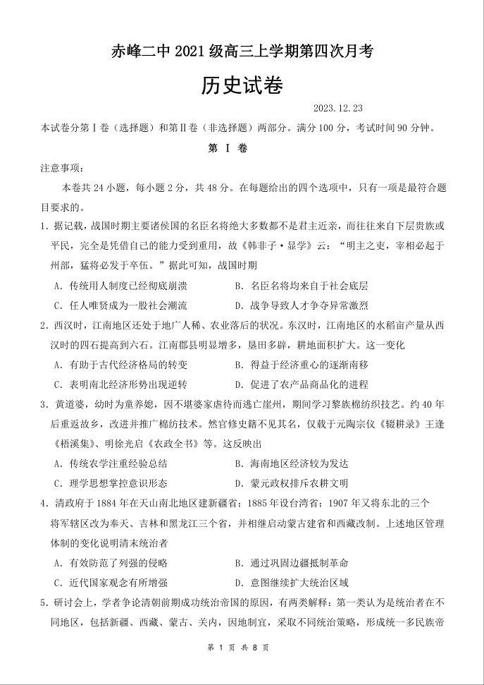 内蒙古赤峰二中2023-2024学年高三上学期第四次月考历史试题