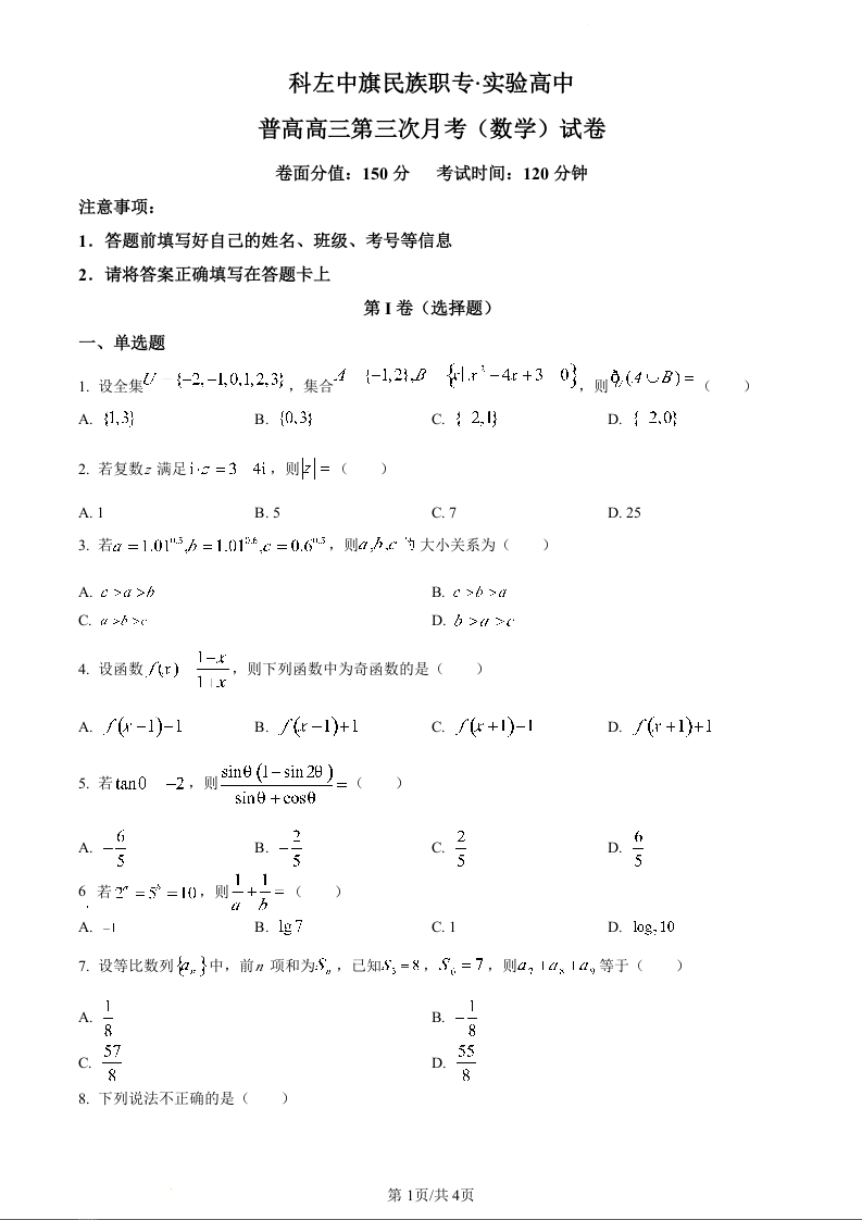 内蒙古科左中旗实验高中2024届高三上学期12月月考数学(理)试题(原卷版)