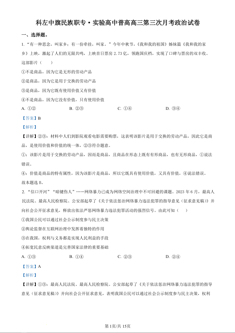 内蒙古科左中旗实验高中2024届高三上学期12月月考政治试题(精品解析版)
