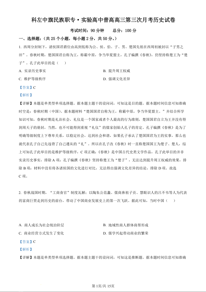 内蒙古科左中旗实验高中2024届高三上学期12月月考历史试题(精品解析版)