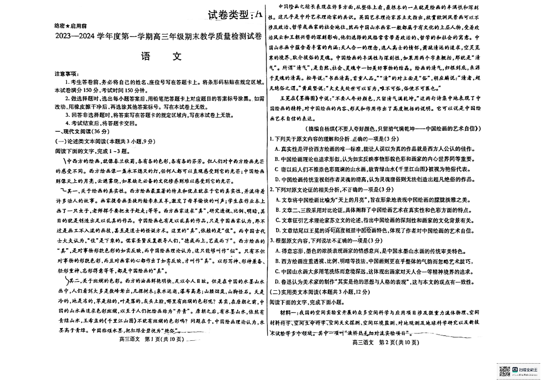内蒙古包头市2023-2024学年高三上学期期末考试语文