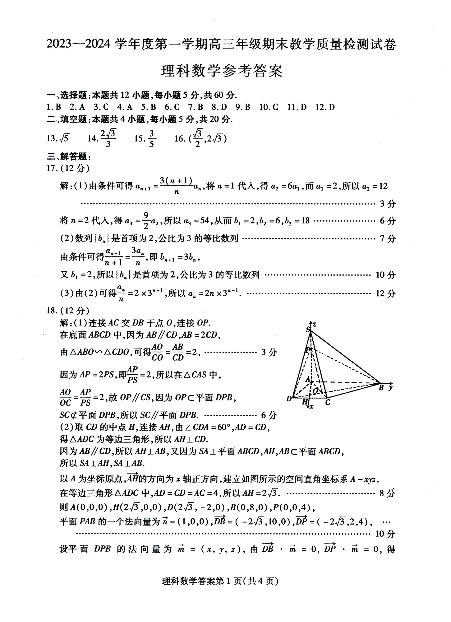 内蒙古包头市2023-2024学年高三上学期期末考试数学(理)答案